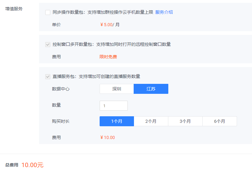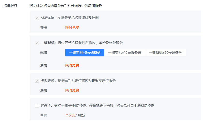 - 增值服務如果處于限時免費狀態,則會默認勾選免費開通;如果需要收費則可選進行購買,勾選對應增值服務將會為購買的每臺云手機都開通增值服務;