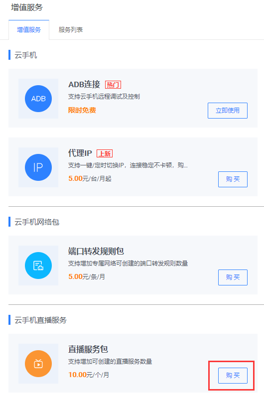 - 以云手機的代理IP服務為例,首先進入用戶控制臺 > 云手機頁面,點擊左側菜單的增值服務進入服務頁面;