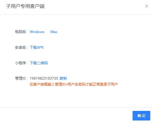 - 其中管理ID需要在登錄子賬號時在客戶端進行填寫,需由管理員提供給子賬號用戶。