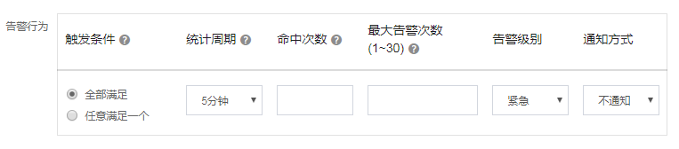 - 告警行為用于設置觸發條件、統計周期、告警級別、通知方式等。