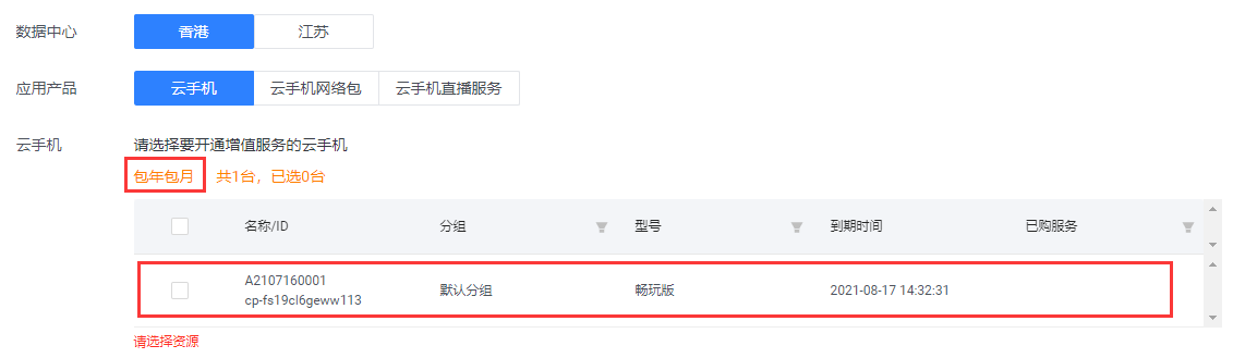 - 在服務購買頁將會分數據中心列出未購買代理IP服務的云手機資源(僅支持為包年包月類型的云手機購買增值服務),如圖: