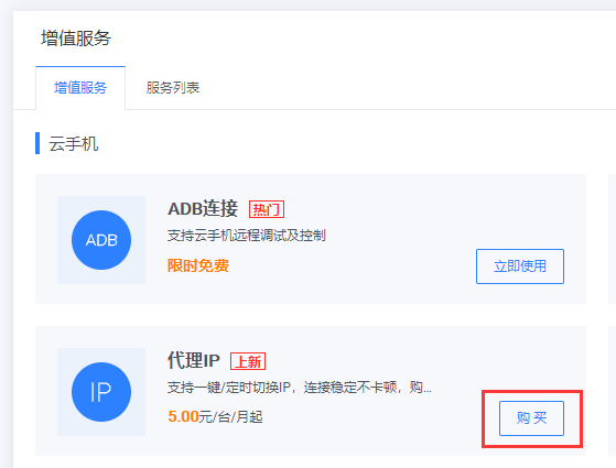 - 以云手機的代理IP服務為例,首先進入用戶控制臺 > 云手機頁面,點擊左側菜單的增值服務進入服務頁面;