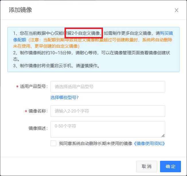 平臺默認免費提供(gong)2個鏡像配額,如需制作(zuo)更多自定義鏡像需購買(mai)鏡像配額包(bao);