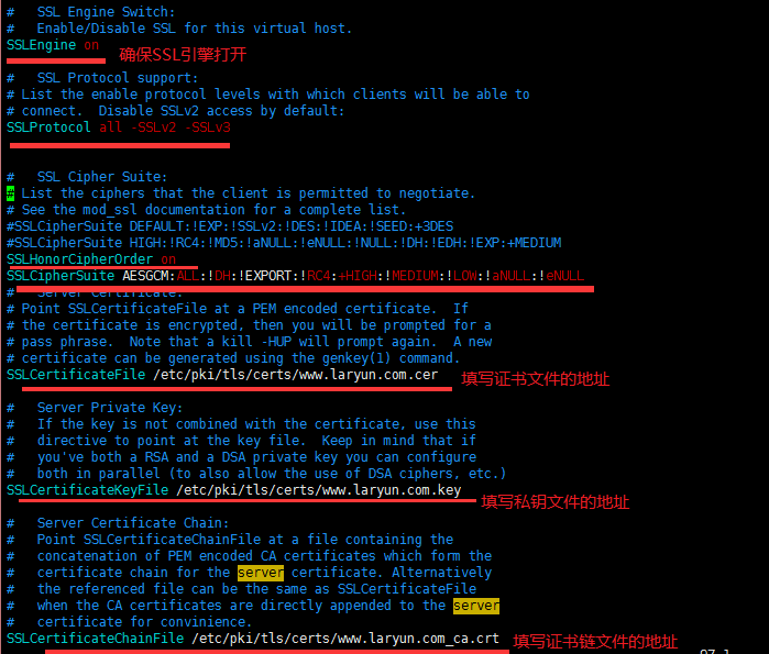 SSL證書證書(shu)部署在Apache服務器(qi)上部署SSL證書本頁總覽在Apache服務器上部署SSL證書操作步驟?打開 Apache 安裝目錄下 conf 目錄中的 httpd.conf 文件,一般在這個目錄下:/etc/httpd/conf/httpd.conf。找到以下內容并去掉“#”使其生效。打開 Apache 安裝目錄下 conf/extra/conf.d/ssl.conf 文件。在配置文件中查找以下配置語句,并填寫好相關配置。重啟Apache服務。注意:證書部署后,需確認在防火墻中將 https 的443端口打開允許訪問。