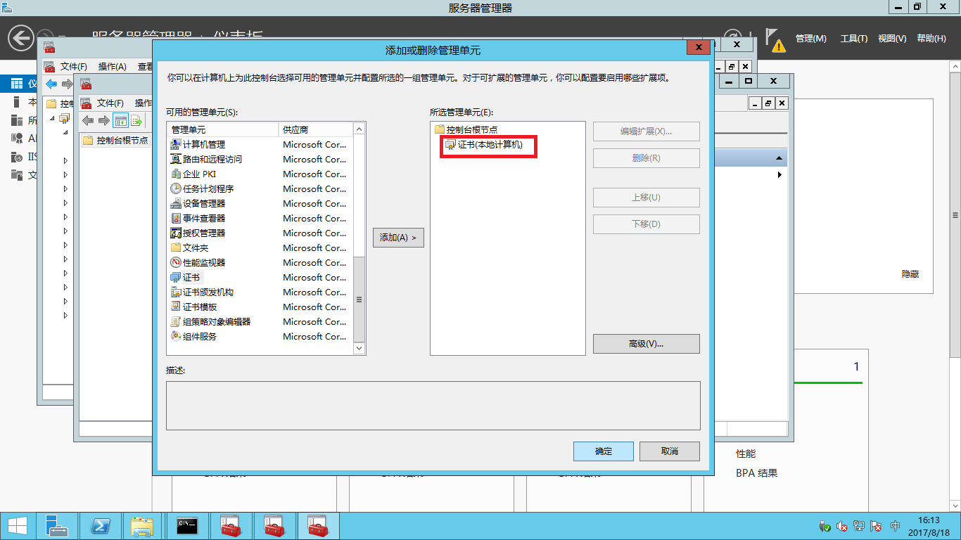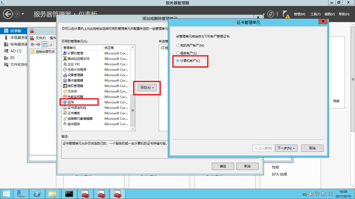 - 點擊證書->添加,選擇計算機賬戶 ,單擊下一步。