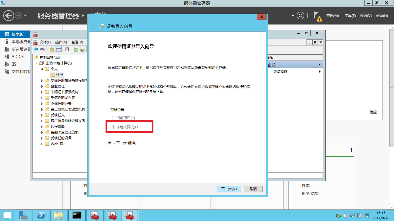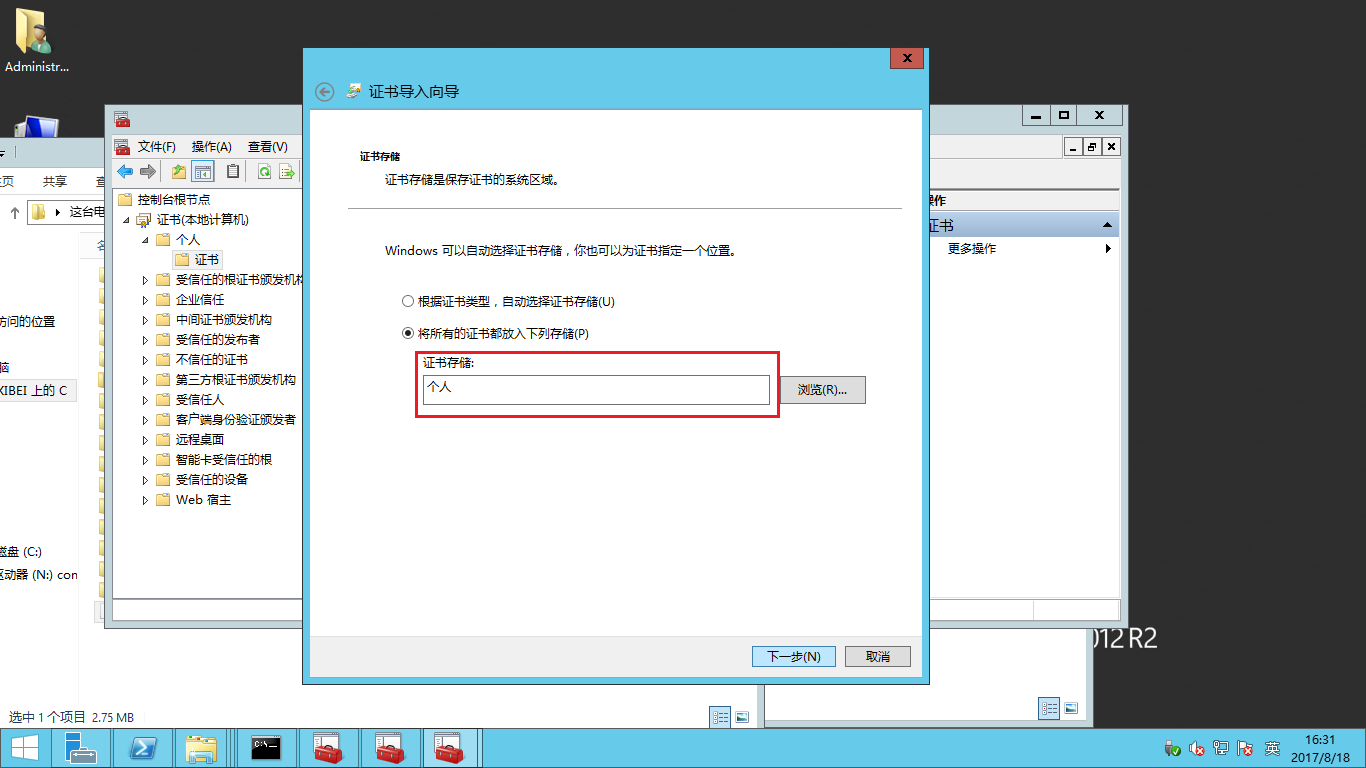 - 將證書存儲選擇為個人,然后點擊下一步。