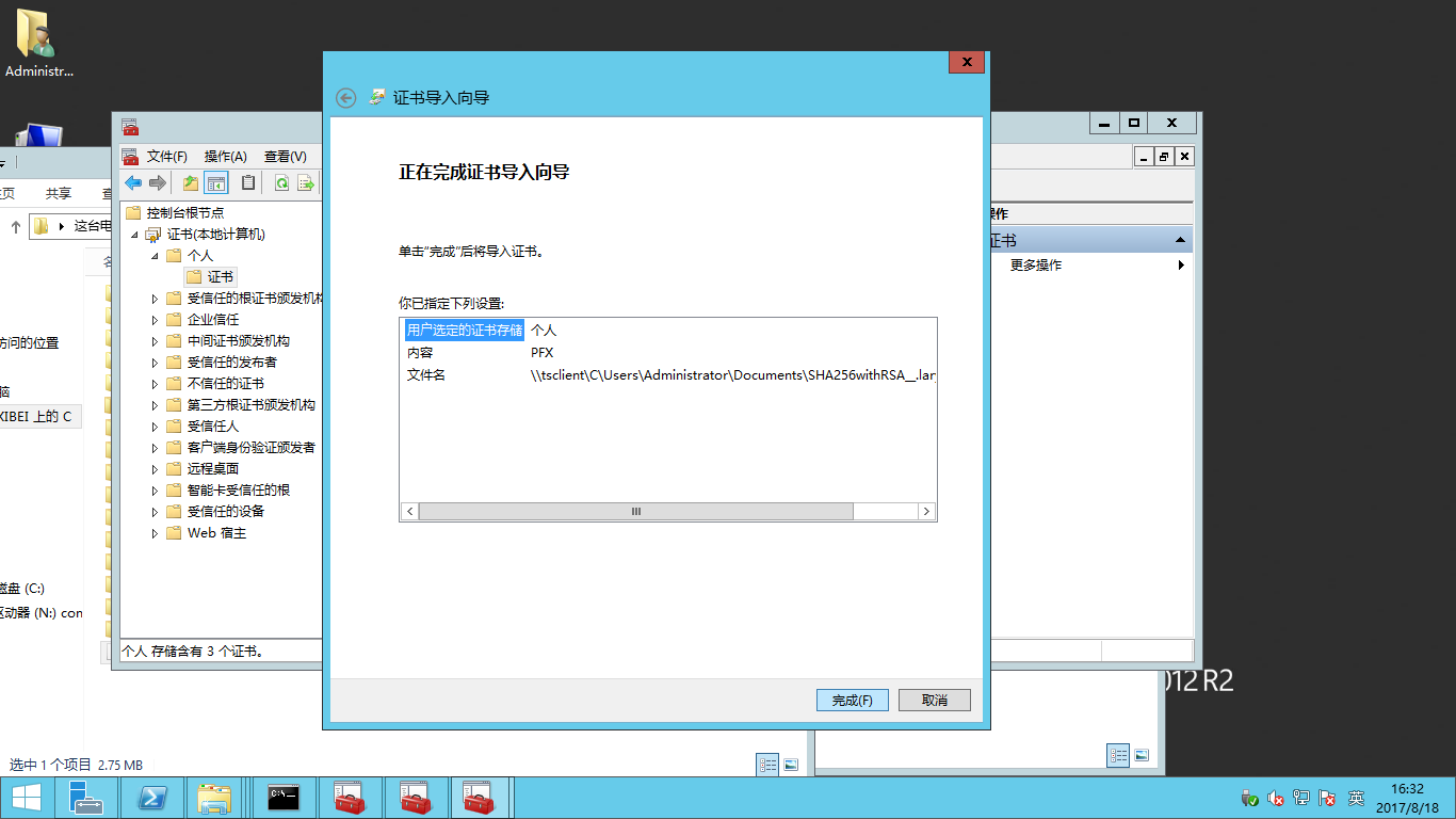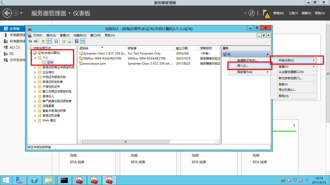 - 點擊證書(本地計算機)->個人->證書。然后在頁面右側點擊更多操作->所有任務->導入,進入證書導入向導。