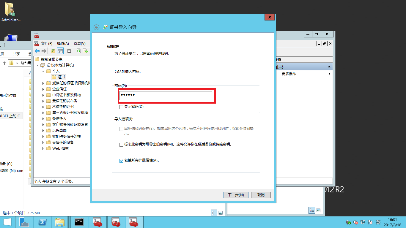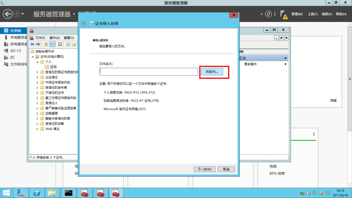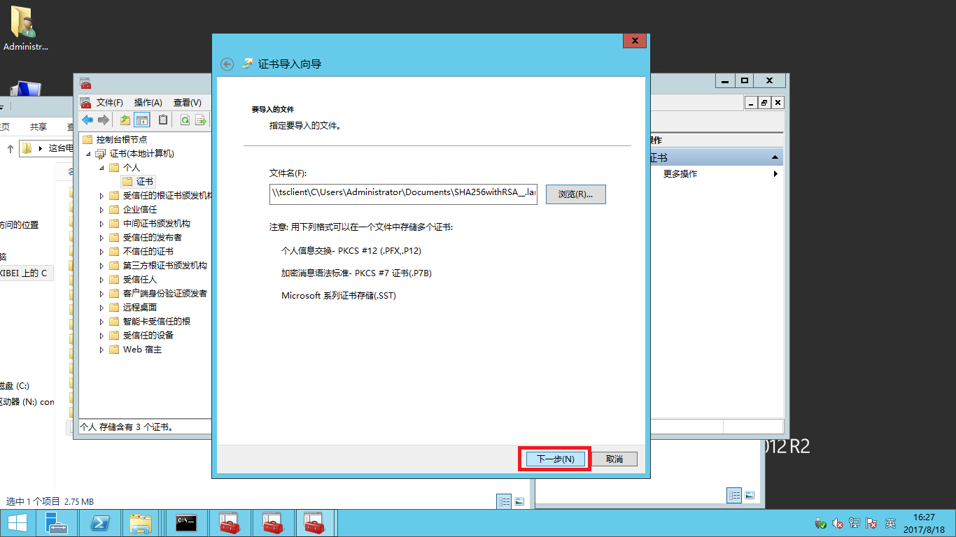 - 選擇證書文件之后,點擊下一步。