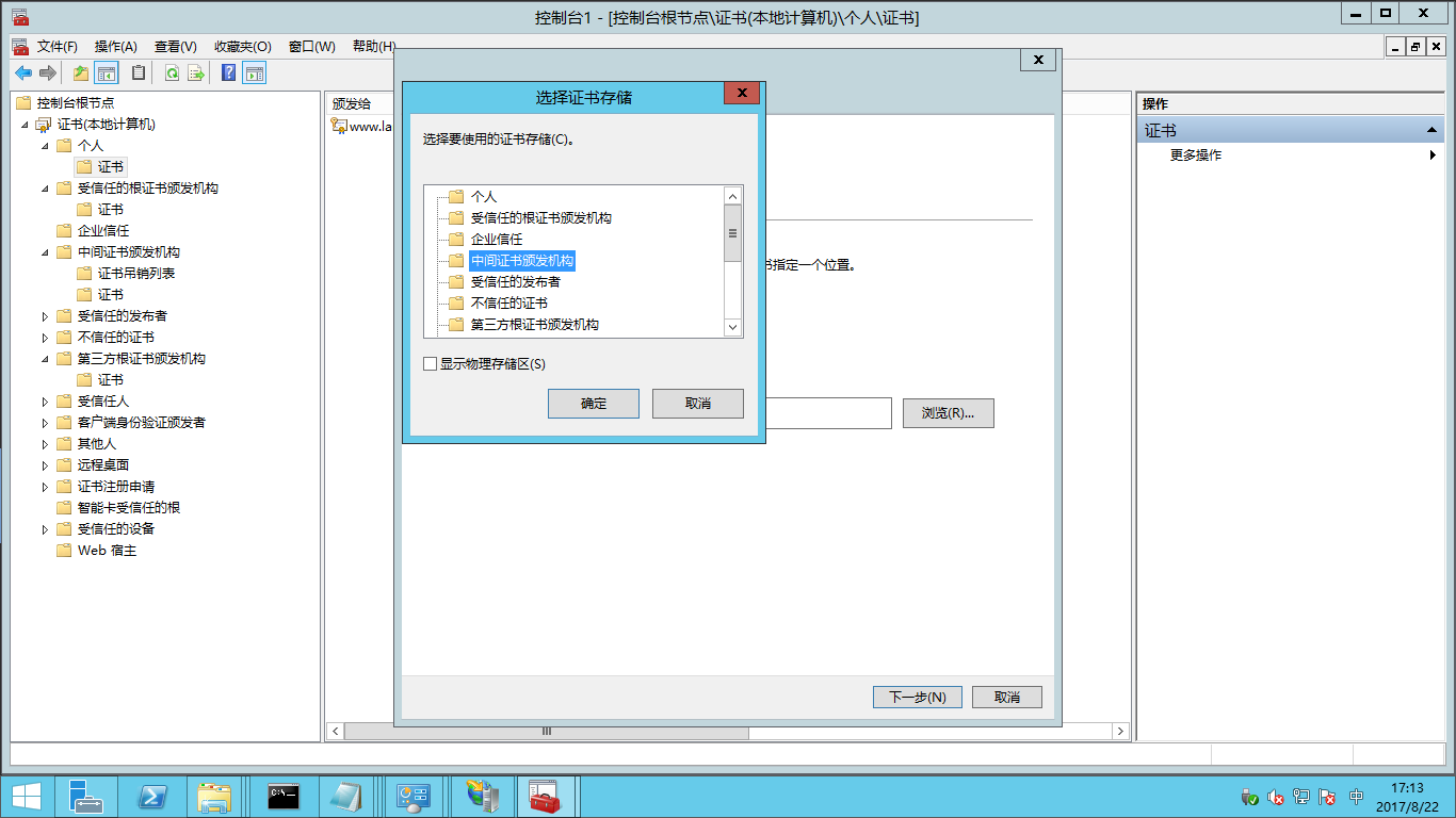 - 按照步驟(6)~步驟(13)導入證書鏈文件。 導入證書鏈文件時,在(6)中選擇中間證書頒發機構->證書,再點擊 更多操作->所有任務->導入。在(9)中注意選擇對應的文件(chain文件)。在(12)中選擇證書存儲時,對應的選為中間證書頒發機構。