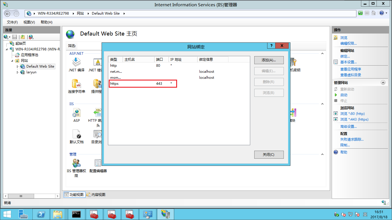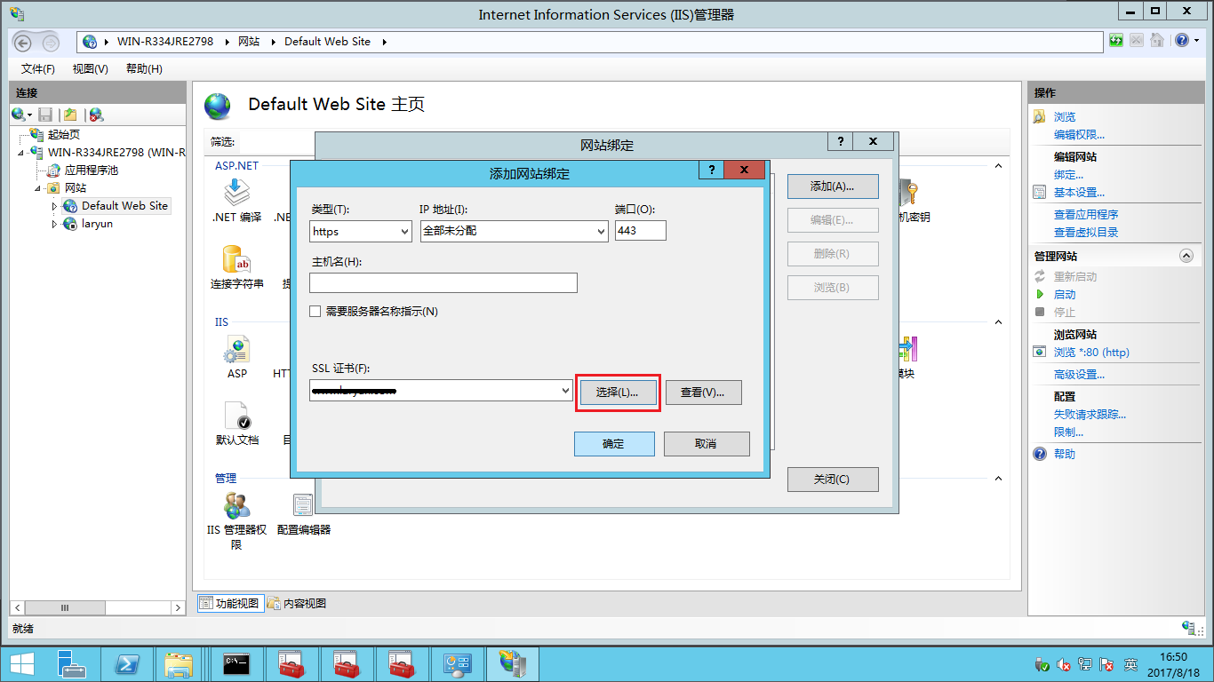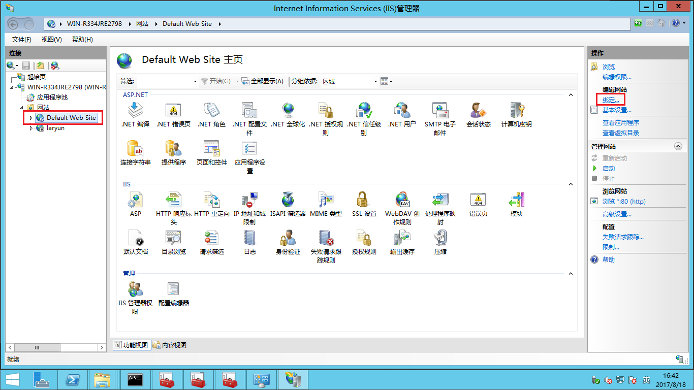 - 接下來到IIS的站點里選擇配置證書。打開IIS管理器,點擊Defult Web Site,然后點擊右側的綁定。
