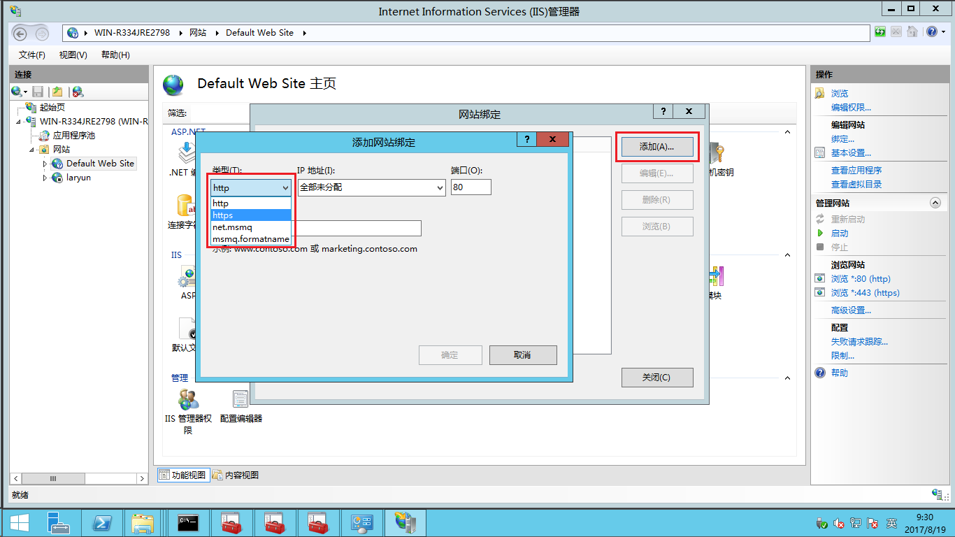 - 在跳出的網站綁定彈窗上點擊添加按鈕,在添加網站綁定的彈窗中選擇類型為 https。