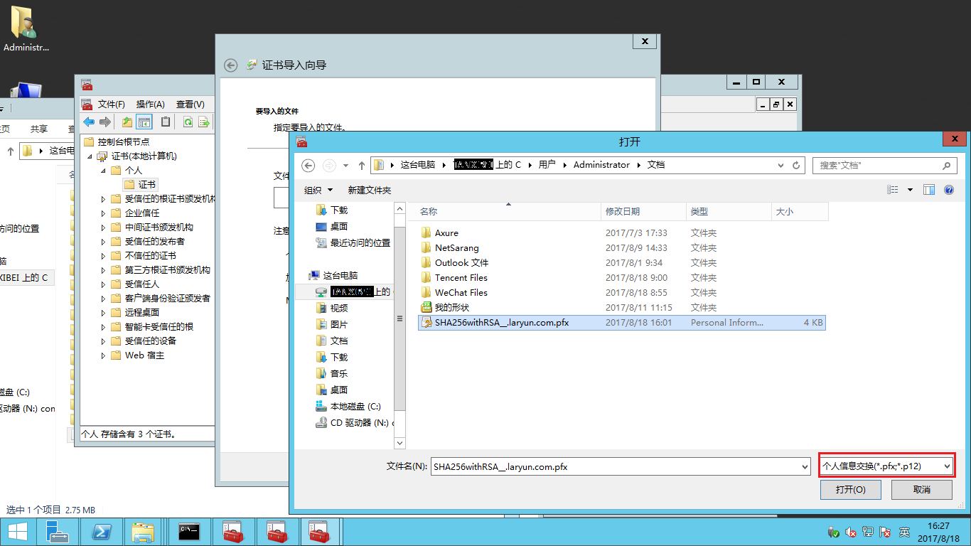 - 選擇文件夾之后,需要將文件的類型按照證書的后綴選擇,此處為.pfx,這樣才能看到證書文件并進行選擇。